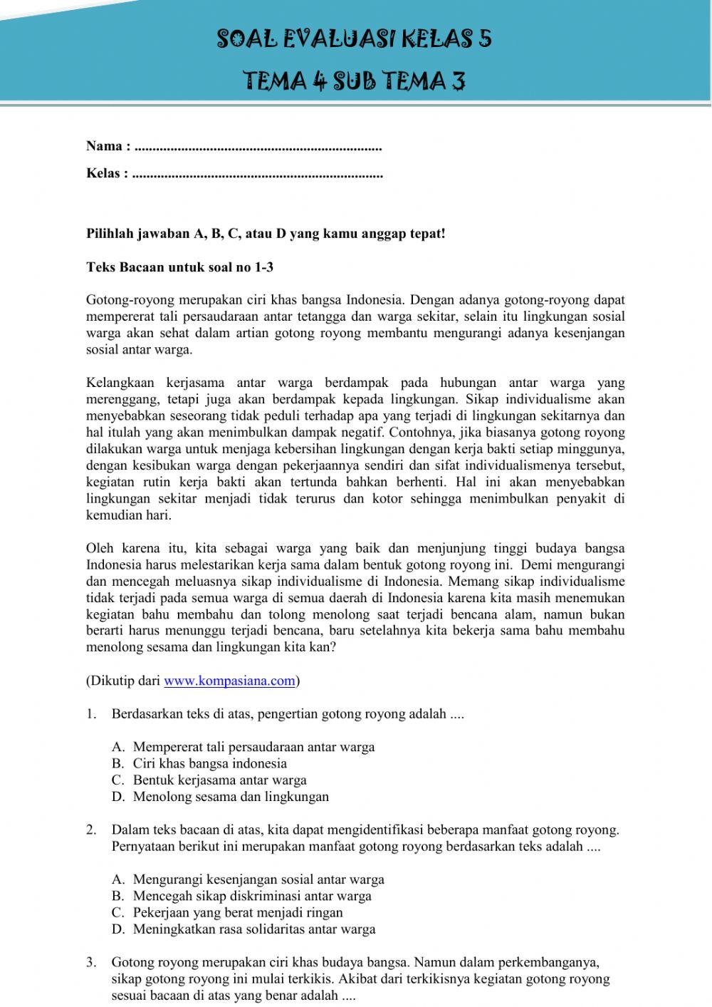 Soal-soal ini mencakup berbagai mata pelajaran yang terintegrasi dalam tema ini, seperti Bahasa Indonesia, PPKn, dan IPS.